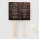 Programa de cerimônia de casamento/ordem de serviço em leques manuais em madeira marrom escura rústica com texto cor creme. Esses leques incluem o programa da cerimônia juntamente com os nomes dos pais da noiva e do noivo, o celebrante, a corte de honra e outros participantes. Entre em contato conosco para obter ajuda com personalização ou produtos correspondentes.