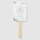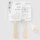 Ventiladores de mão do programa de casamento com fontes florais azuis empoeiradas, texto minimalístico e texto caligrafia.
