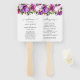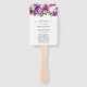 Ventilador de Mão do Programa de Casamento Floral com peões em roxo vibrante e ousado, fuschia e violeta junto com o título e o cabeçalho traseiro em uma escrita balbuciosa com baloiços. Estes elegantes fãs de mão do programa de casamento com tom de joia em tons brilhantes de roxo são excelentes para um casamento de verão.