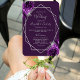 Este elegante fã do programa de casamento apresenta uma estrutura geométrica prateada decorada com buquês florais roxos e prateados. O texto aparece em letras elegantes de cinza prateada e fontes em prata sobre fundo roxo.
