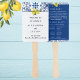 Adicione um toque de charme mediterrânico ao seu dia especial com este Fã do Programa Casamento Italiano personalizado, maravilhosamente projetado para manter seus hóspedes legal durante sua cerimônia de núpcias no verão. Apresentando uma típica borda azul e branca do azulejo italiano, limões amarelos vibrantes e fonte azul marinho chic contra um fundo branco nítido, este ventilador é a combinação perfeita de elegância rústica e charme inspirado nos citros. Na moda e manutenção funcional, este fã do programa de casamento mediterrânico é ideal para uma celebração beijada ao sol cheia de beleza italiana eterno.