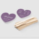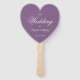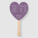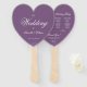 Um fã do programa de casamento em forma de coração simples mas elegante para uma cor de casamento roxa empoeirada. Os títulos e os nomes (e as iniciais) da noiva e do noivo são escritos em uma escrita elegante, o restante em bonés. O fundo é roxo empoeirado, o texto é branco. No verso, tem no lado esquerdo o programa da cerimônia de casamento e, no lado direito, a festa de casamento (com 2 colunas diferentes para a equipe da noiva e do noivo). e sob eles uma pequena mensagem de agradecimento.