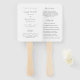 Leque de mão de programa de casamento tradicional com um design simples com seus nomes em uma escrita elegante e os detalhes do seu evento em uma fonte serif clássica.