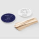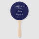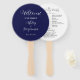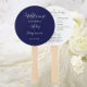 Programa do dia do casamento impresso em um leque manual estilo redondo que apresenta uma cor azul marinho moderna no fundo da frente com os nomes dos noivos em letras brancas estilizadas. O verso do programa lista os participantes da festa de casamento e os ritos da cerimônia em um fundo branco com letras cinza escuro. Edite o leque e substitua as informações do programa de casamento pelas suas. Perfeito para uma cerimônia de casamento interna ou externa! Selecione o número de programas de leque desejado.