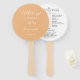 O programa do dia do casamento impresso em um fã de mão estilo redondo que apresenta um fundo de cor de pêssego e de tendência no lado frontal com os nomes de noiva e noivo em um roteiro branco e estilizado. O verso do programa lista os participantes da festa de casamento e os ritos da cerimônia em um fundo branco com a inscrição das cinzas escuras. Edite o fã de mão e substitua as informações do programa de casamento por suas próprias. Perfeito para uma cerimônia de casamento no interior ou no exterior! Selecione o número de programas de ventilador manual desejados.