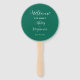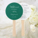 Programa de dia de casamento impresso em um leque manual estilo redondo que apresenta uma cor de fundo esmeralda moderna na parte da frente com os nomes dos noivos em letras brancas estilizadas. A parte traseira do programa lista os participantes da festa de casamento e os ritos da cerimônia em um fundo branco com letras cinza escuro. Edite o leque manual e substitua as informações do programa de casamento pelas suas. Perfeito para uma cerimônia de casamento interna ou externa! Selecione o número de programas de leque manual desejado.
