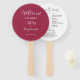 O programa do dia do casamento impresso em um fã de mão estilo redondo que apresenta um plano de fundo de cor tinto de vinho no lado frontal com os nomes da noiva e do noivo em um roteiro branco e estilizado. O verso do programa lista os participantes da festa de casamento e os ritos da cerimônia em um fundo branco com a inscrição das cinzas escuras. Edite o fã de mão e substitua as informações do programa de casamento por suas próprias. Perfeito para uma cerimônia de casamento no interior ou no exterior! Selecione o número de programas de ventilador manual desejados.