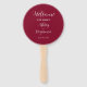 O programa do dia do casamento impresso em um fã de mão estilo redondo que apresenta um fundo vermelho de torcida, cor de morango no lado frontal com os nomes de noiva e noivo em um roteiro branco e estilizado. O verso do programa lista os participantes da festa de casamento e os ritos da cerimônia em um fundo branco com a inscrição das cinzas escuras. Edite o fã de mão e substitua as informações do programa de casamento por suas próprias. Perfeito para uma cerimônia de casamento no interior ou no exterior! Selecione o número de programas de ventilador manual desejados.
