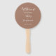 O programa do dia do casamento impresso em um fã de mão estilo redondo que apresenta um fundo cor marrom mocha de tendência no lado frontal com os nomes noiva e noivo em um roteiro branco e estilizado. O verso do programa lista os participantes da festa de casamento e os ritos da cerimônia em um fundo branco com a inscrição das cinzas escuras. Edite o fã de mão e substitua as informações do programa de casamento por suas próprias. Perfeito para uma cerimônia de casamento no interior ou no exterior! Selecione o número de programas de ventilador manual desejados.