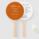 O programa do dia do casamento impresso em um fã de mão estilo redondo que apresenta um fundo cor laranja tendencioso e queimado no lado frontal com os nomes da noiva e noiva em um roteiro estilizado e branco. O verso do programa lista os participantes da festa de casamento e os ritos da cerimônia em um fundo branco com a inscrição das cinzas escuras. Edite o fã de mão e substitua as informações do programa de casamento por suas próprias. Perfeito para uma cerimônia de casamento no interior ou no exterior! Selecione o número de programas de ventilador manual desejados.
