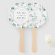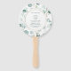 Este fã do programa de cerimônia de núpcias apresenta cores d'água eucalipto e folhas verdes botânicas com uma estrutura em círculo dourado. Para personalização mais avançada deste design, clique no link Personalizar mais para alterar a fonte, o tamanho e a cor.