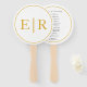 Fãs de mão do programa de casamento elegantes com seu monograma em ouro falso e seus detalhes em itálico sobre um fundo branco. Estes fãs de mão vão fornecer aos seus convidados a ordem de serviço e são perfeitos para um casamento ao ar livre.