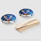 Um divertido rena de desenho animado com um nariz vermelho brilhante e grandes chifres brancos, adornado com um laço vermelho e dourado, espreita por uma janela aberta. Do lado de fora, uma paisagem nevada com silhuetas de pinheiros e uma pequena casa iluminada é visível sob um céu noturno azul escuro cheio de estrelas. O trenó do Papai Noel puxado por renas está voando ao longe. A cena evoca uma atmosfera festiva e caprichosa de Natal. Arte Vetorial Original Copyright BluedarkArt TheChameleonArt.