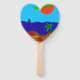 Sich an heissen Sommertagen kühle Luft zu fächeln, mit einem Fächer, auf dem ein Sommertag am Meer zu sehen ist.