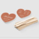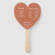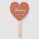 Um fã do programa de casamento em forma de coração simples, mas elegante. O fundo é terracota (castanho-avermelhado), o texto é branco. Os títulos e os nomes (e as iniciais) da noiva e do noivo são escritos em uma escrita elegante, o restante em bonés. No verso, tem no lado esquerdo o programa da cerimônia de casamento e, no lado direito, a festa de casamento (com 2 colunas diferentes para a equipe da noiva e do noivo). e sob eles uma pequena mensagem de agradecimento.