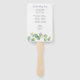 Este elegante fã do programa de núpcias botânicas de alta qualidade mostra minha mão original pintada com a cor d'água, girassol amarelo e folhas de eucalipto. O verde é feito em tons verdes em um fundo branco nítido. Os nomes da noiva e do noivo e a linha cronológica do programa de casamento são definidos na escrita à mão e na tipografia sans serif. Este design de dois lados é uma escolha floral para casamentos de celeiro rústicos, casamentos de campo e casamentos de jardim. Projetado por Victoria of VG Invites. Para ver mais informações, visite o VG Invites no Zazzle