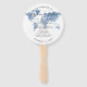 Ventilador do Programa de Casamento do Mapa do Mundo Azul e Branco para um tema de viagem ou casamento de destino. Personalizar é muito fácil, você pode alterar fontes, cor do texto, cor do plano de fundo e design clicando em PERSONALIZAR MAIS.