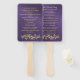 Elegante fã formal do programa de casamento feito em uma aparência brilhante brilhante violeta de tendências, com gráficos de uma decoração de ouro florescente, na parte inferior. Personalize o texto, em ambos os lados do fã, para o dia do seu casamento.