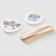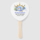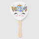 Fã de festas bonitas, com gráficos de um rosto de gatinho com grandes lascas oculares, ouros e coroa e flores azuis na cabeça. As costas têm gráficos de uma coroa maior dourada com flores azuis e texto personalizado pronto para personalizar o seu evento.