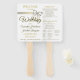 Esses lindos fãs com um programa de casamento impresso neles são uma forma excelente de deixar seus convidados seguirem com a cerimônia. Projetada com texto dourado, a frente tem toda a informação básica com uma design de fitas e arcos brancas e douradas. As costas têm detalhes da cerimônia e festa de casamento. Todo texto é totalmente personalizável.