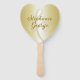 Ventiladores de casamento em forma de coração em cor de ouro. Um grande sinal de "e" guarda os primeiros nomes do casal de um lado com "e data" no outro. O texto do script é castanho-ouro escuro. "Ter e manter a partir deste dia" é o ditado que está nas costas, com a data do casamento no fundo. Você pode mudar a forma para qualquer outro, exceto o retângulo.