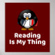 Pinguim "Ler é a minha coisa" bonito e engraçado segurando seus livros.
