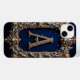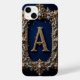 Letra A dourada intricada adornada com joias e pérolas situada dentro de uma moldura decorativa em estilo vintage contra um fundo azul profundo, enfatizando luxo, elegância e sofisticação em design artístico.