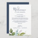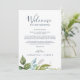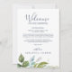 Esta carta de boas vindas e cartas itinerantes são perfeitas para um elegante casamento no meio do verão. O design botânico apresenta um arranjo exuberante de cor d'água pintada, eucalipto, verde e folhas verdes com sutis manchas de flores rosadas e cor-de-rosa. A frente da carta apresenta uma carta de boas-vindas e a parte de trás da carta apresenta o itinerário do casamento. Estas notas são perfeitas para casamentos de destino e bolsas de boas-vindas de hóspedes.
