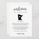 Compartilhe uma mensagem de boas-vindas para seus convidados de casamento em Minnesota, assim como um itinerário ou agenda dos eventos do fim de semana. Front mostra sua mensagem de boas vindas com um mapa da silhueta do estado de Minnesota com um dentro do coração. Personalize o reverso com o dia do casamento ou o itinerário do fim de semana do casamento. Perfeito por incluir nas bolsas de boas-vindas do hotel ou entregar aos quartos dos seus convidados.