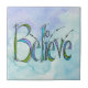 Proteja a sua mesa ou contra-top quando utilizar este Azulejo cerâmico alegre Crença Impressionante. Enquanto isso, "Acredite", a letra da mão é um design divertido criado por Designs de Debi Payne para aqueles com uma mentalidade positiva. Cada letra da palavra "Acredite" é criada por múltiplas linhas que têm vários padrões em preto e branco incorporados às linhas. As letras apresentam as cores verde, verde e roxo para dar à palavra uma paleta de cores agradável. A palavra "Acredite" está colocada sobre um fundo de lavagem de cor-de-água azul e lacrimejante.