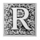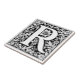Letra Iluminada Medieval R Azulejo Cerâmico Um vetor preto e branco da letra em um elaborado estilo medieval, criado no estilo de Albrecht Dürer. O design é um quadrado com um grande motivo floral central rodeado por padrões e espirais geométricos simétricos.