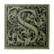 Letra decorativa encantadora S monograma inicial. Tipografia no estilo caligrafia. William Morris primeira carta em preto sobre o livro de vinhaça verde do abacate de vintage com folhas de Ginkgo biloba esbranquiçadas.