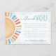 Este cartões de agradecimentos ensolarado foi projetado para combinar com nossa coleção de cores d'água Sunshine! Este tema de verão é perfeito para qualquer sexo, garoto ou garota, com tons relaxantes de azul, laranja e amarelo. Este design apresenta uma aquarela solar e fundo, juntamente com um fundo correspondente. Para editar com os detalhes do evento, clique em "Personalizar" ou "Detalhes" e, em seguida, elimine o texto pré-preenchido e substitua-o pelo seu próprio texto. Por favor, não hesite em contactar-nos se tiver quaisquer perguntas.