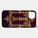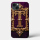 Uma armação ornamental impressionante, dourada, enfeitada com pérolas e pedras de gema, colocada contra um fundo vivo de veludo roxo.