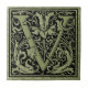 Letra decorativa encantadora V monograma inicial. Tipografia no estilo caligrafia. William Morris primeira carta em preto sobre o livro de vinhaça verde do abacate de vintage com folhas de Ginkgo biloba esbranquiçadas.