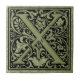 Letra decorativa encantadora X monograma inicial. Tipografia de estilo caligráfico. William Morris primeira letra a preto sobre o livro verde da safra do abacado com folhas de Ginkgo biloba esbranquiçadas.