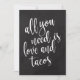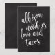 Um letreiro de casamento elegante e moderno, com o texto "Tudo o que você precisa é amor e tacos" em uma fonte de letra extrovertida, a textura da pincelada adiciona um sentimento espontâneo e divertido. A cor do fundo pode ser personalizada de acordo com as suas necessidades e preferências, por favor entre em contato se tiver alguma solicitação especial.