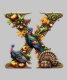 The design is a vibrant and festive representation of Thanksgiving, combining seasonal autumn elements with a playful cartoon turkey. At the heart of the image, the letter "X" stands out, adorned with vibrant leaves, pumpkins, and acorns, evoking a delicate autumnal atmosphere. Beside the letter stands a charming cartoon turkey, adding a touch of fun and personality to the design.