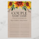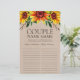 Esta adorável folha de jogos de azar e girassóis LGBTQ Nome do Casal Jogo, noiva ou casal é elegante e encantadora - perfeita para qualquer jardim, botânica, rústica, romântica, floral, formal ou casamento vintage. A sua combinação requintada de flores solares de cor aquática graciosa e multiabdominal e verde sábia é florida, delicada e bela. Este jogo fácil e divertido traz muitas risadas a qualquer chá. Basta dar uma folha a cada convidado (não se esqueça das canetas) e deixar a diversão começar! Ficará surpreso com quantas pessoas aparecem com palavras longas usando os nomes do casal feliz. Para torná-lo seu, basta selecionar Personalizar este modelo e digitar os nomes dos casadores.