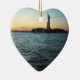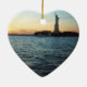 Fotografia da estátua da liberdade no por do sol. Ilumine acima da época natalícia com este símbolo da liberdade e da liberdade!
