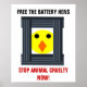 Esta poster bonitinha tem uma mensagem muito séria. O design apresenta um pintinho amarelo com olhos pretos e um bico laranja a espreitar atrás de uma gaiola quadrada de metal. O texto em negrito e preto acima da imagem diz, "Liberte as galinhas-bateria". O texto vermelho em negrito abaixo da imagem diz "pare a crueldade dos animais agora!" O poster é branco com uma borda preta. Este design está disponível em vários posters de tamanho diferente, o maior dos quais é mostrado aqui. Esta poster é para pessoas que amam animais e desejam que eles sejam tratados melhor.