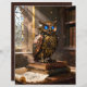 A clockwork owl with saphhire eyes is perched on a stack of books in an old library. Dust, or perhaps smoke from overheated servos, rises around it. Very nice steampunk image!
