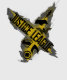 Este gráfico preto e dourado tem o novo logotipo do filme Liga da Justiça desenhado na diagonal com os logotipos individuais de herói da Liga da Justiça agrupados para formar um traço contracorrente na diagonal.