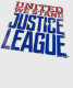 Este gráfico patriótico da Liga da Justiça está inclinado para o lado e tem a frase "United We Stand" escrita em cima do logotipo da Liga da Justiça.