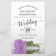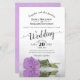 Este belo convite para o casamento apresenta uma design romântica com um solteiro de rosa lilás, púrpura, deitado do lado dele e refletindo numa piscina de água. A tipografia apresenta caligrafia de script e um layout sofisticado. O dorso é uma cor púrpura clara marmoreada. Uma maravilhosa maneira de convidar seus amigos e família para compartilhar sua alegria em seu dia especial.