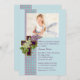 Uma bela imagem herdeira de uma cruz de madeira com lilases brancos e lavandas. A cruz repousa sobre uma fita de verificação azul e rosa e um fundo azul. Este sofisticado convite religioso é perfeito para Primeiras Comunizações Sagradas ou Confirmações.O cartão é fácil de personalizar com seu texto, fonte, cor da fonte e escolha de seis tipos de papel.