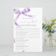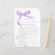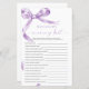 Jogo "Quem Conhece Melhor a Mamãe" com Laço Lavanda – Adicione diversão ao seu chá de bebê com este charmoso cartão de jogo com um delicado design de laço roxo. Este jogo "Quem Conhece Melhor a Mamãe" é perfeito para envolver os convidados e celebrar a futura mamãe com estilo. Com letra elegante e detalhes femininos, este cartão de jogo é uma bela adição a qualquer tema de chá de bebê, tornando-se uma lembrança memorável para a mamãe e seus entes queridos.