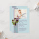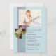 Uma linda imagem de herança de uma cruz de madeira com lilases brancas e lavanda. A cruz repousa sobre uma fita xadrez azul e rosa e um fundo azul. Este convite sofisticado e religioso é perfeito para Primeiras Comunhões ou Crismas.