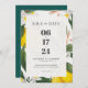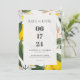 Lenon simboliza luxo, amor e longevidade. Este elegante design de convite para o casamento mostra limão pintado à mão e flores brancas em um fundo branco texturizado, criando um na moda e convidando a atmosfera.
