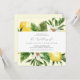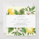 Este convite de casamento amarelo-limão é perfeito para um casamento de primavera ou verão. O design mediterrânico rústico apresenta limões aquosos brilhantes e bonitos com flores brancas boêmicas e folhas verdes elegantes.